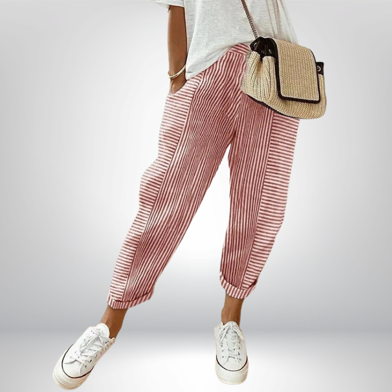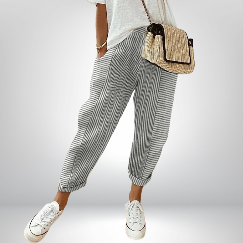 Spodnie Marilyn charakteryzują się luźnym krojem oraz modnym, pionowym wzorem w paski. Dzięki wygodnemu stanowi średniej wysokości i lekko zwężanym nogawkom, idealnie układają się na sylwetce, tworząc swobodny i elegancki look.